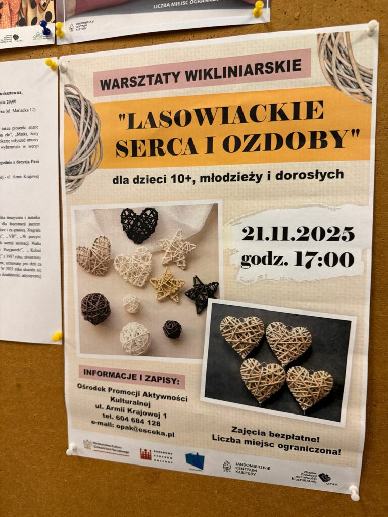 21 listopada w Ośrodku Promocji Aktywności Kulturalnej odbyły się warsztaty wikliniarskie „Lasowiackie serca i ozdoby”. W spotkaniu uczestniczyły dzieci, młodzież oraz dorośli, zainteresowani tradycyjnymi technikami plecionkarskimi i lokalnym dziedzictwem kulturowym.